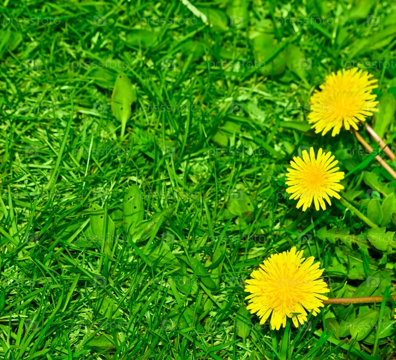 Желтые одуванчики на фоне зеленой травы
