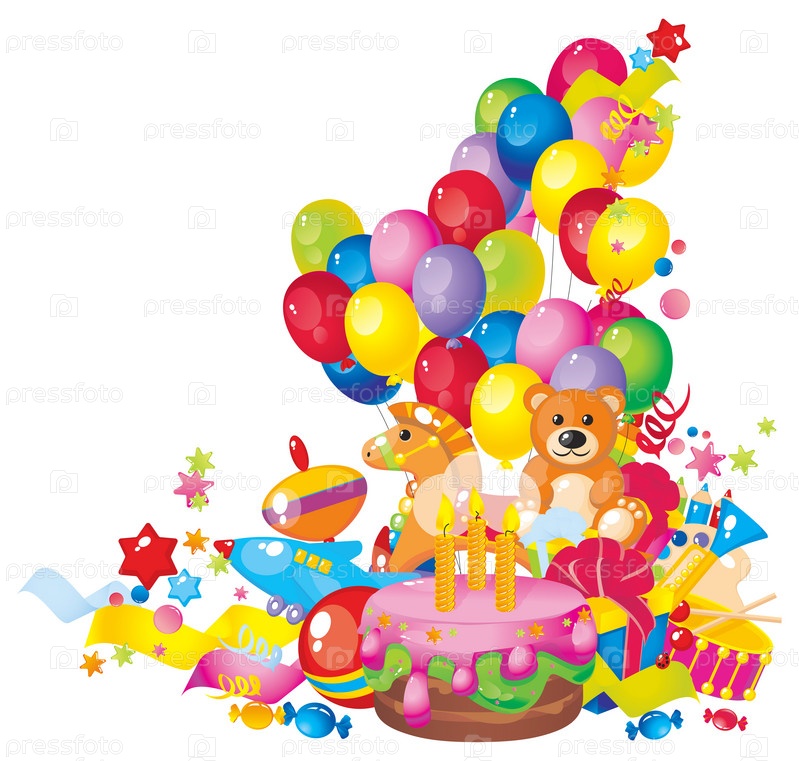 Детская праздничная открытка с нарисованными воздушными шарами и подарками на белом фоне