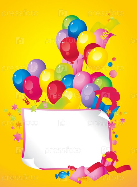 Детская праздничная открытка с нарисованными воздушными шарами на желтом фоне