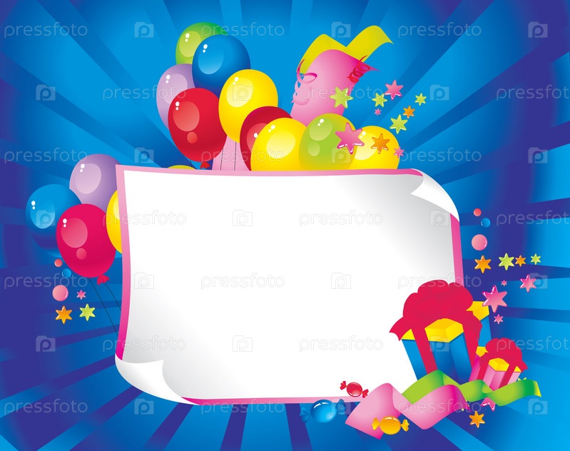 Детская праздничная открытка с нарисованными воздушными шарами и подарками на синем фоне