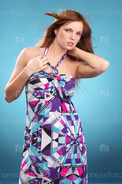 Девушка в сарафане на синем фоне