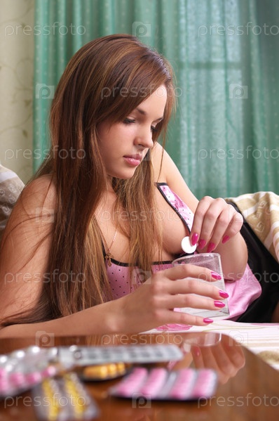 Девушка опускает аспирин в стакан с водой