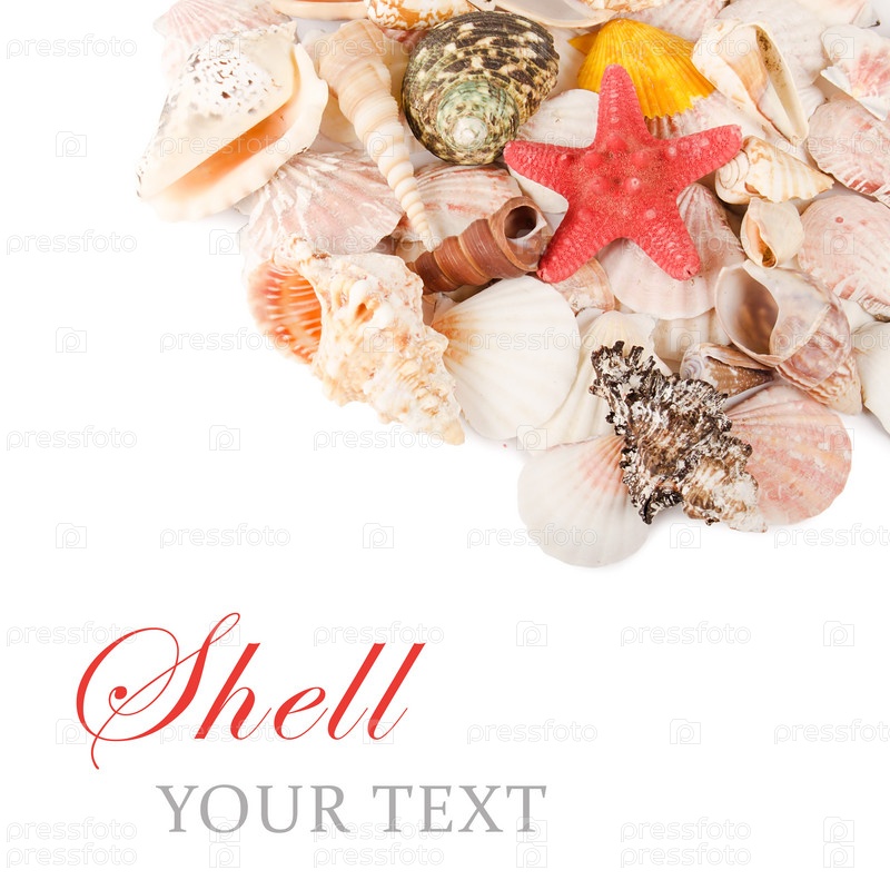 Морские ракушки и место для текста на белом фоне