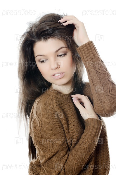 Красивая брюнетка в коричневом свитере на белом фоне