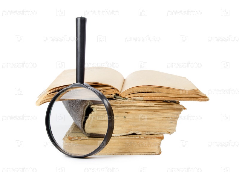 Стопка старых книг и лупа на белом фоне