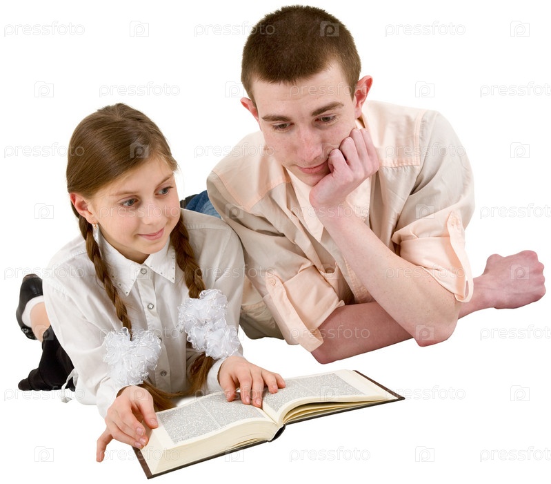 Девушка и молодой человек читают книгу в положении лежа на белом