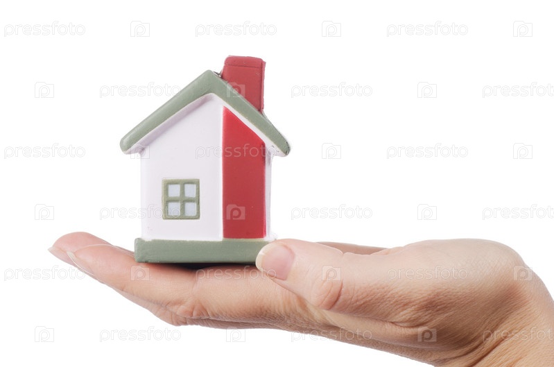 Модель дома в женских руках на белом фоне
