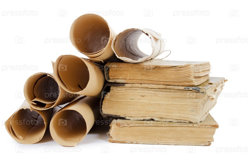 Старые свитки и книги на белом фоне