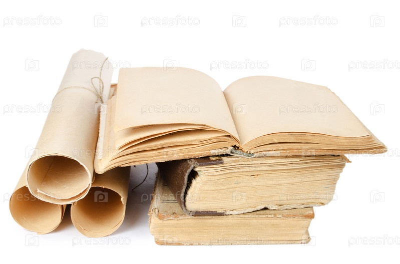 Старые свитки и книги на белом фоне