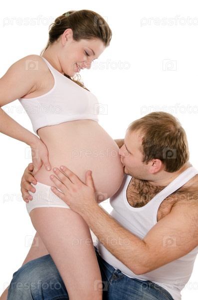 Беременная женщина и ее муж на белом фоне