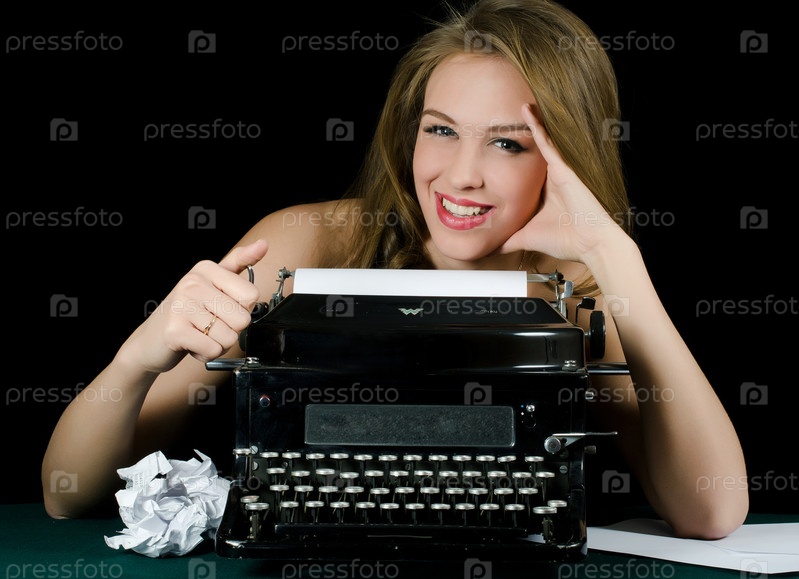 Портрет красивой девушки с печатной машинкой на черном фоне