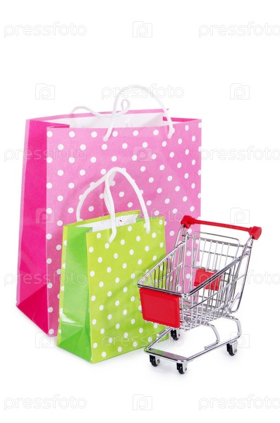 Корзина и пакеты для покупок, изолированные на белом фоне