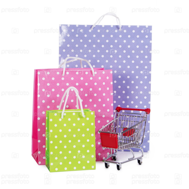 Корзина и пакеты для покупок, изолированные на белом фоне