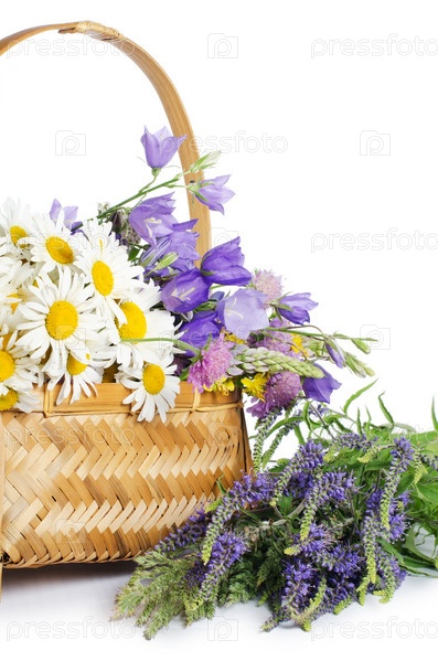 Летние цветы в корзине на белом фоне