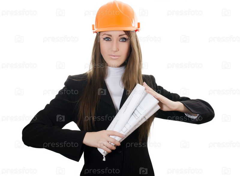 Молодая женщина в каске с чертежами на белом фоне