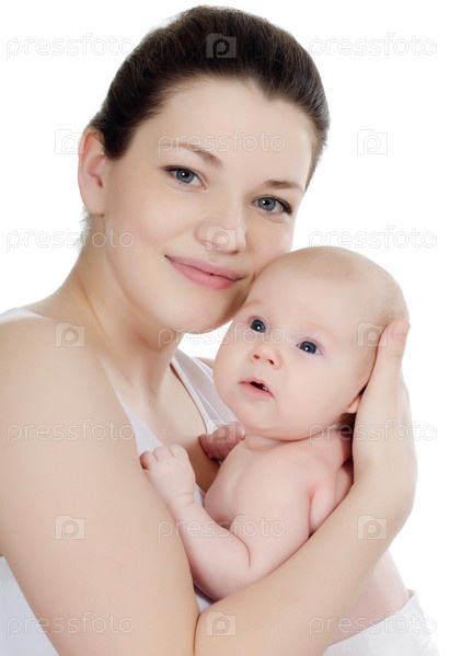 Счастливая мама с малышом на белом фоне