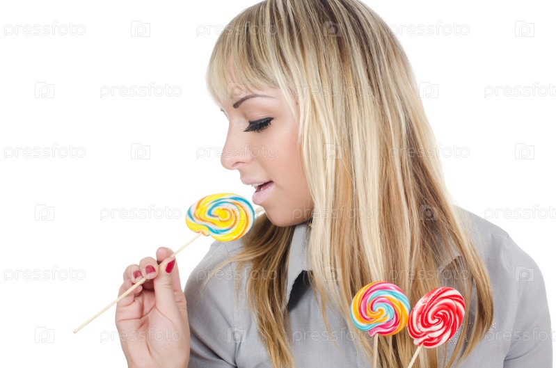 Девушка с леденцами на белом фоне
