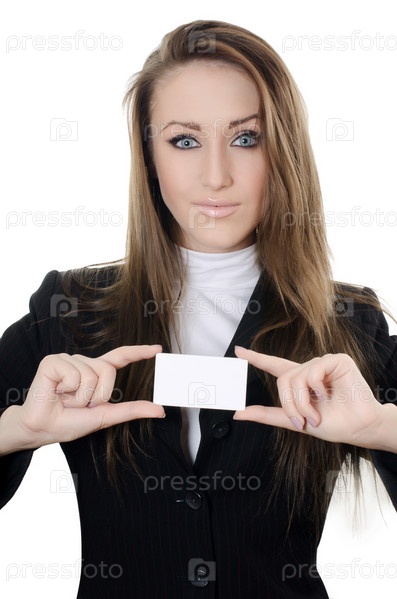 Деловая женщина с визитной карточкой на белом фоне