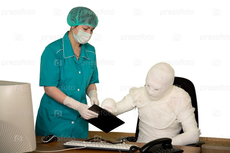 Обвязанный босс и медсестра в офисе