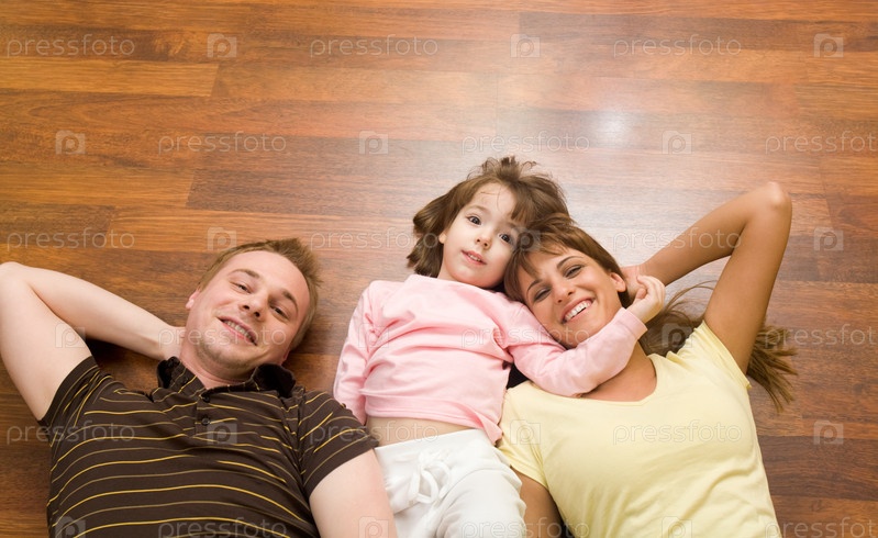 Вид сверху веселых членов семьи, лежащих на полу и смотрящих в камеру