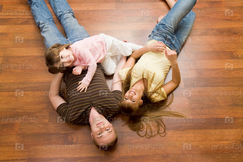 Вид сверху отдыхающей семьи, лежащей на полу и смотрящей в камеру