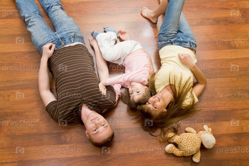 Вид сверху отдыхающей семьи, лежащей на полу и смотрящей в камеру