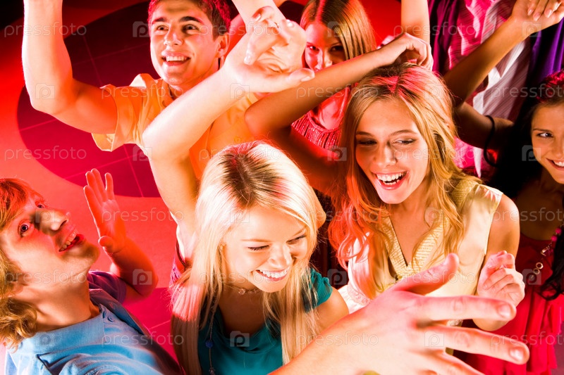 Веселые друзья, играющие в клубы на дискотеке рядом друг с другом с улыбками