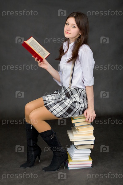 Девушка - школьница с кучей книг на черном фоне