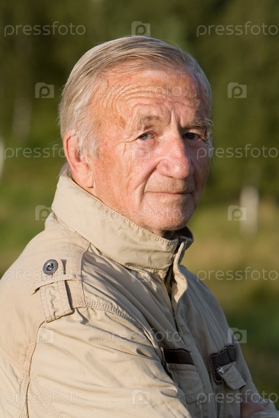 Портрет седой пожилой мужчины в бежевом куртке в деревне на природе