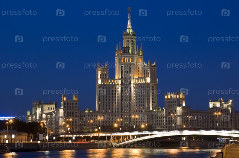 Россия, Москва, город ночи.Здание и река и мост