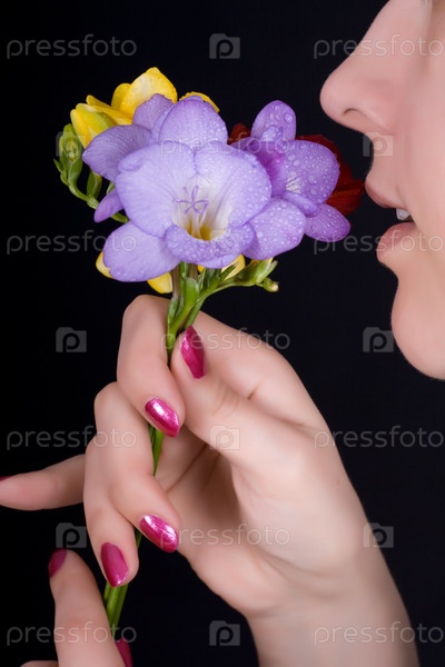 Женщина нюхает цветы фрезии, на черном фоне