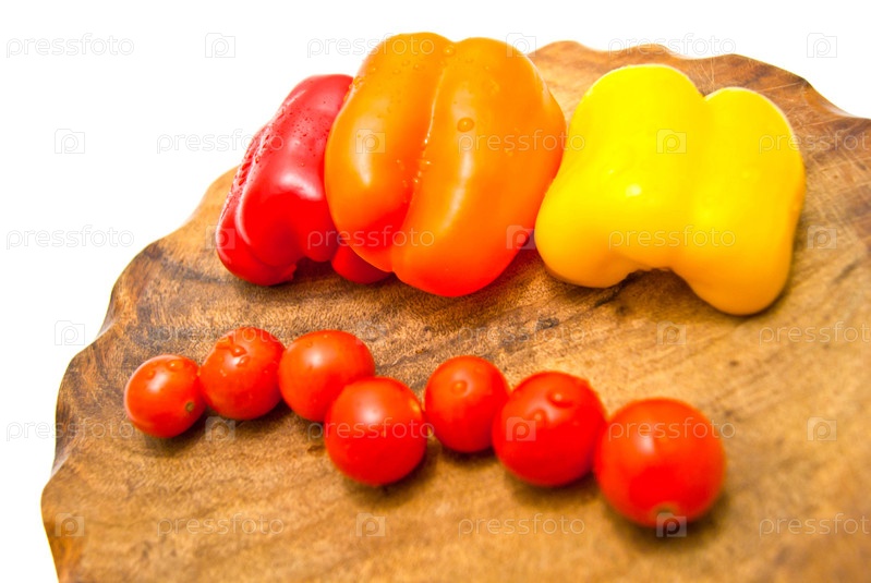 Болгарские перцы и помидоры черри на кухонной доске на белом фоне