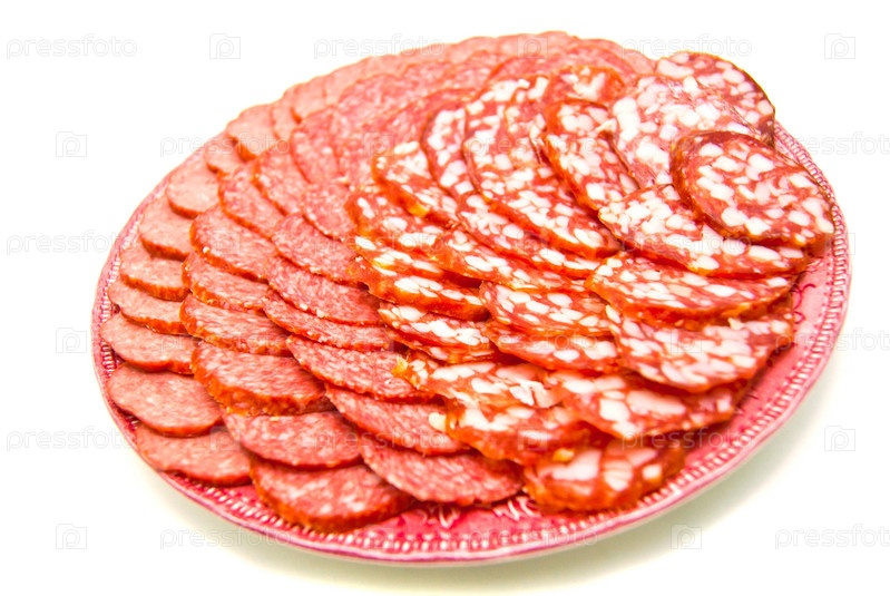 Тарелка с кусочками колбасы на белом фоне