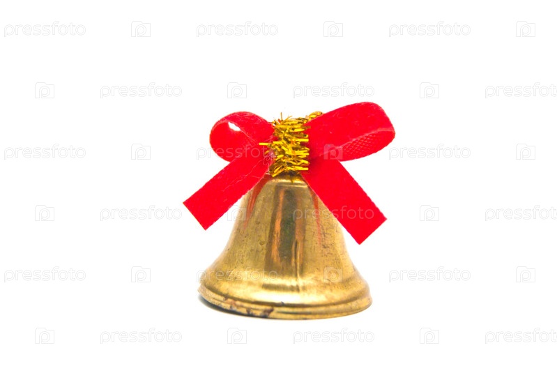 Золотой колокольчик с красной лентой на белом фоне