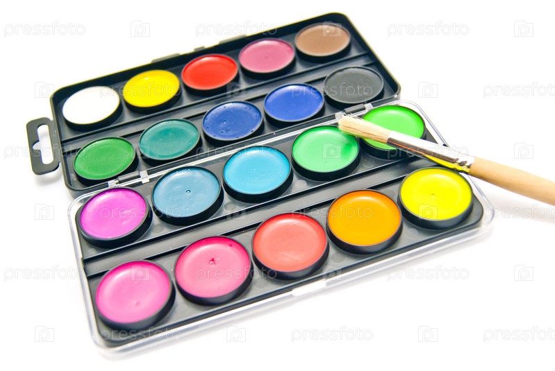 Акварельные краски и кисть на белом фоне