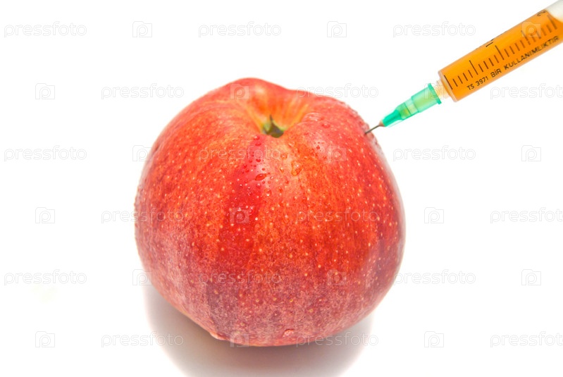 Шприц в красном яблоке на белом фоне