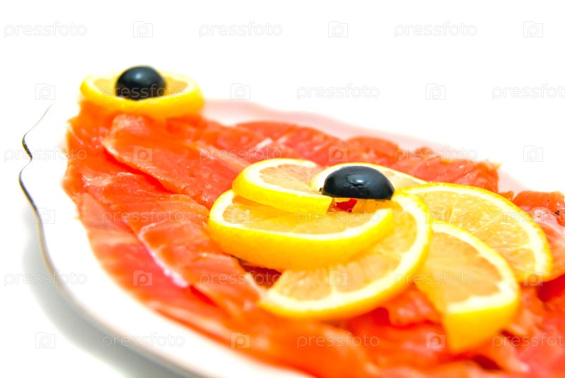Копченый лосось с лимоном и маслинами на тарелке