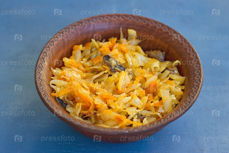 Тушеная капуста в деревянной миске