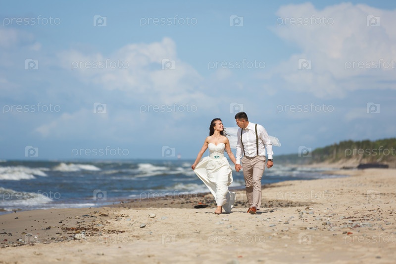 Счастливые молодожены на пляже