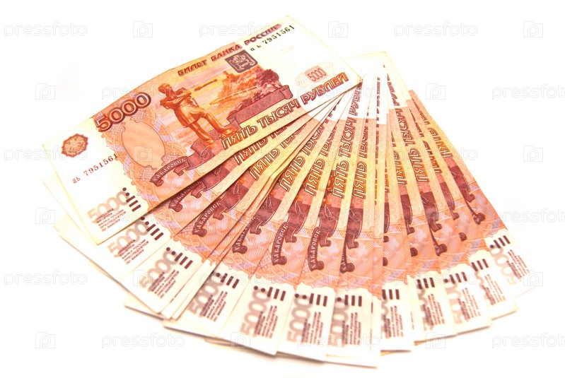 Российский пятитысячные банкноты на белом фоне