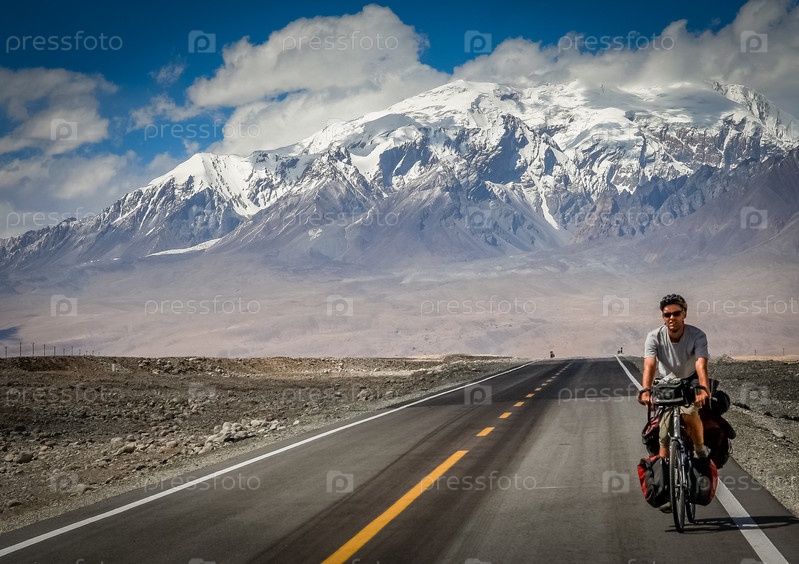 Велосипедист на шоссе в горах