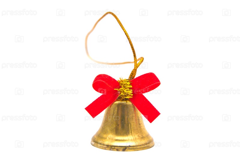 Золотой колокол с красной лентой на белом фоне