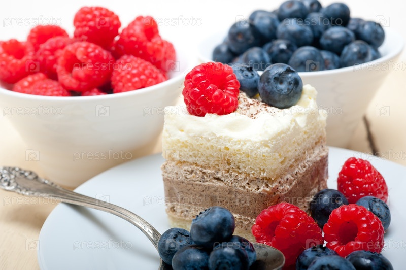 Кусочек торта с малиной и черникой