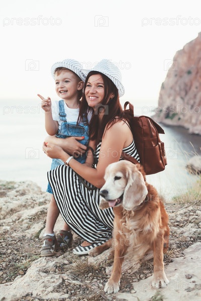 Мать и сын с собакой на прогулке