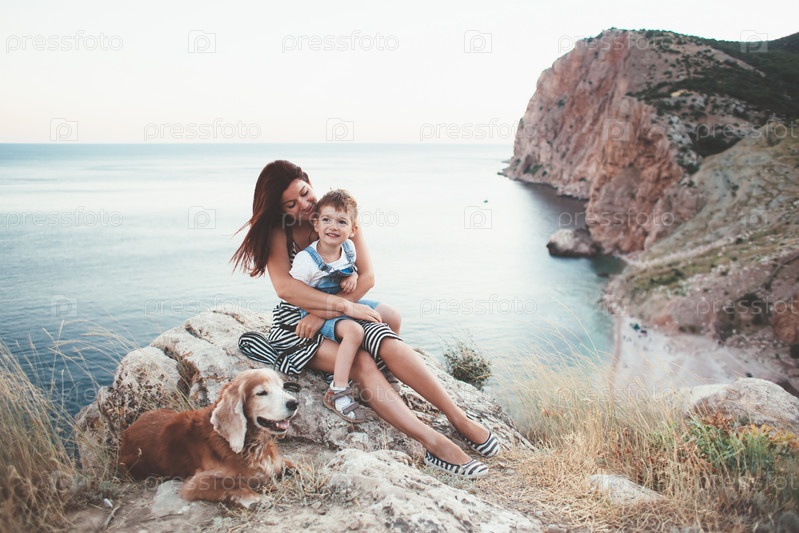 Мать и сын с собакой на прогулке