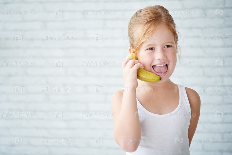Милая девочка разговаривает по банану