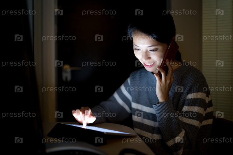 Девушка разговаривает по телефону при свете планшета