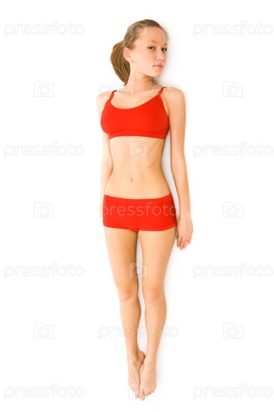 Портрет здоровой женщины в красном нижнем белье, смотрящей на камеру