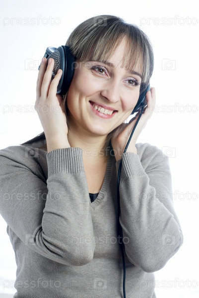Молодая женщина с наушниками, изолирована на белом фоне