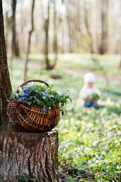 Корзина с цветами в лесу
